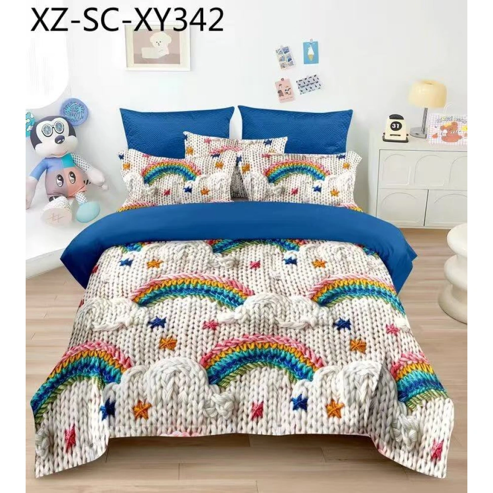 Curcubeiele tricotate, norii și stelele aduc o energie vibrantă, în timp ce culorile contrastante de albastru și alb luminează dormitorul. Întins în această mare de curcubee, în fiecare noapte vei adormi urmărind curcubeiele într-un basm, lăsând minunăția și romantismul copilăresc să înflorească în visele tale.